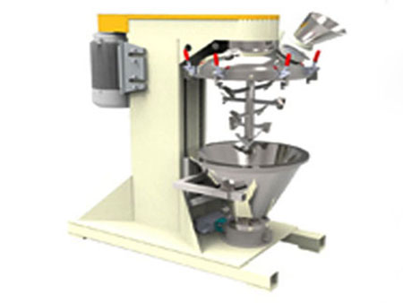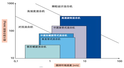 产品通过锥形混合腔顶部投入,投料范围在30%-100%之间,设备中间有一个顶部驱动的高速转轴,因此便去除了在产品区域的密封设计以及轴承。在轴上有紧贴内壁的桨式混合原件。通过高速旋转的搅拌桨和锥形内仓的共同作用将产品由底部带至混合腔的上部。当产品达到顶部的时候又重新回落到混合仓中心,如此的产品的方式形成了一种快速的宏观混合。